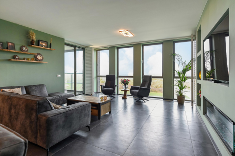 - Woonkamer met houten vloerdelen en openslaande deuren naar de achtertuin;